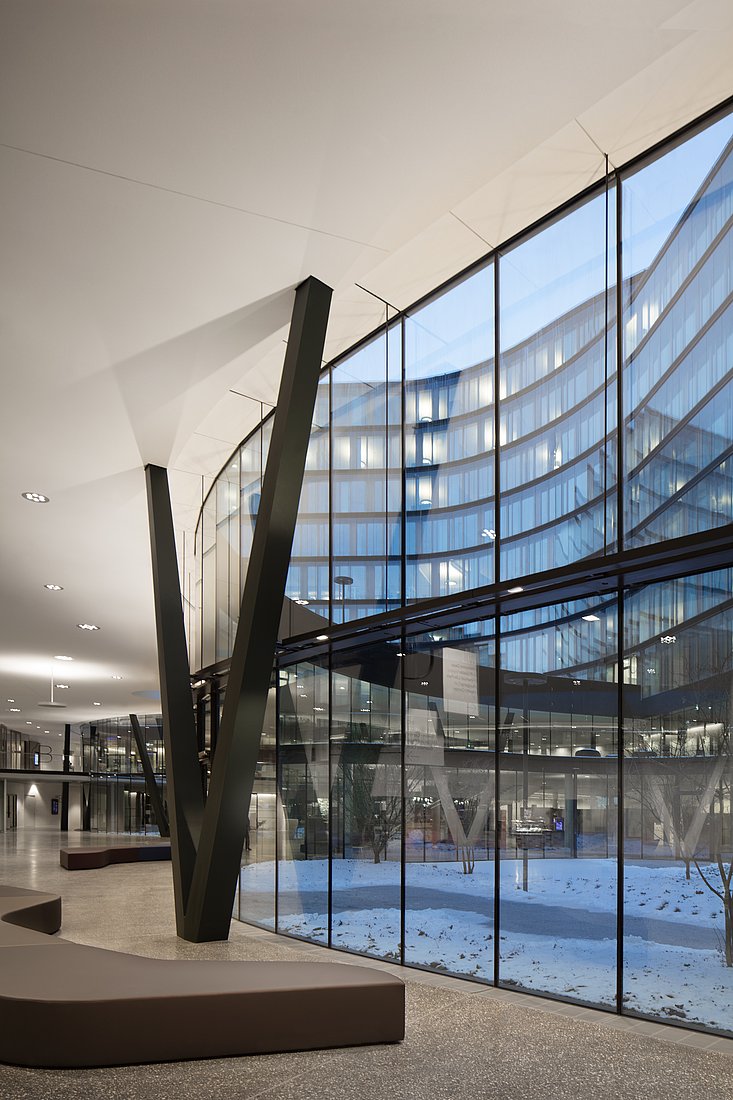 Die Idee des Lichtentwurfes für den Erste Campus liegt in der Verschränkung und Ineinanderüberführung der verschiedenen Bauteile durch eine gemeinsame visuelle Komponente. Die Transparenz, die in der Architektur angelegt ist, wird im Lichtentwurf aufgenommen, ermöglicht und unterstrichen. Die Innenhöfe, die Gartenlandschaft sind wichtiger Teil des Lichtkonzeptes und ermöglichen die Transparenz der großzügig verglasten Flächen auch in den Abendstunden.